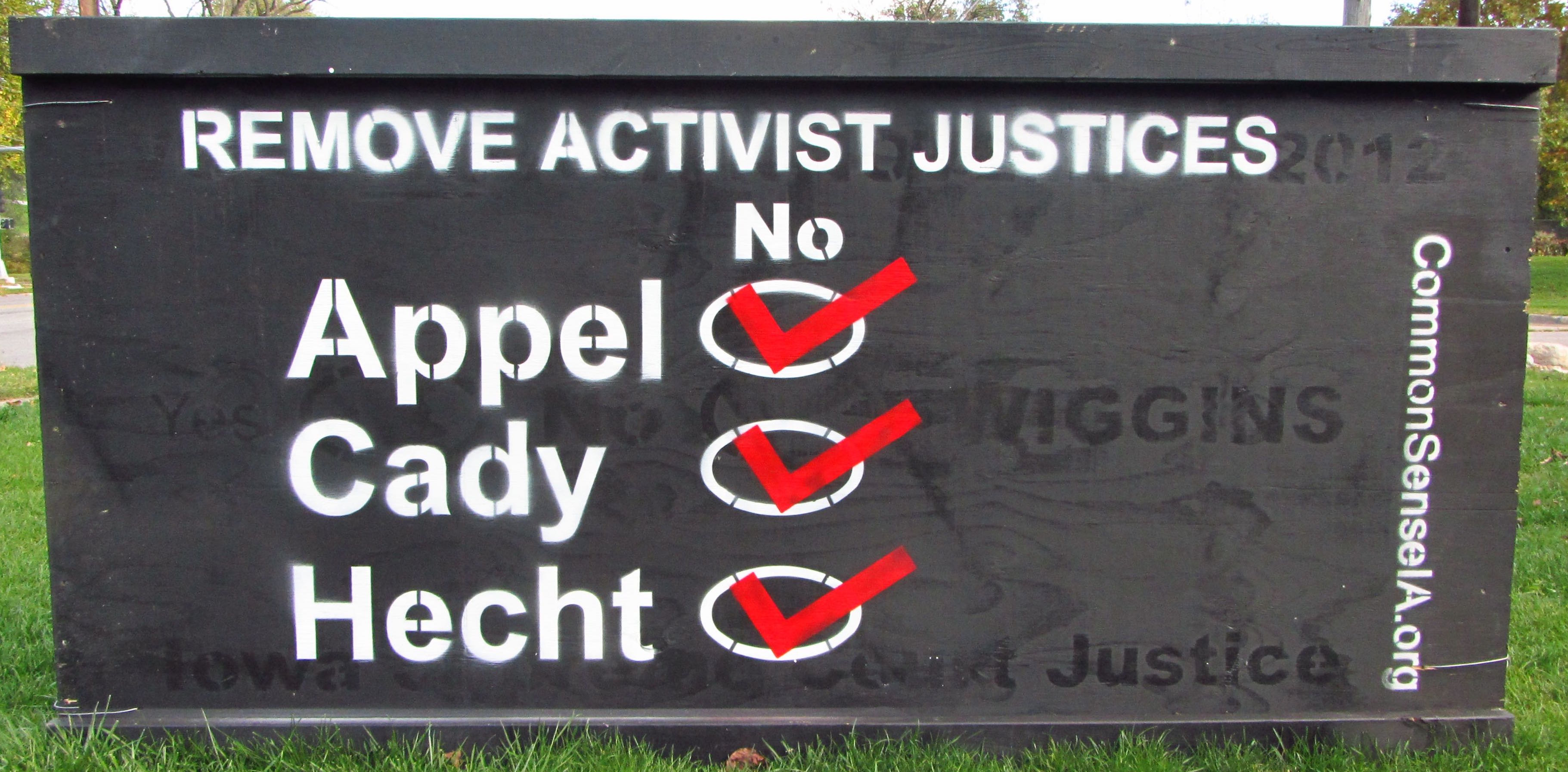 I saw no mass-produced anti-retention yard signs in 2016, just some hand-made ones that appeared to come from the religious political advocacy group Common Sense Iowa. If you look closely, you can tell someone painted over a “No Wiggins” sign from 2012 to make this statement: