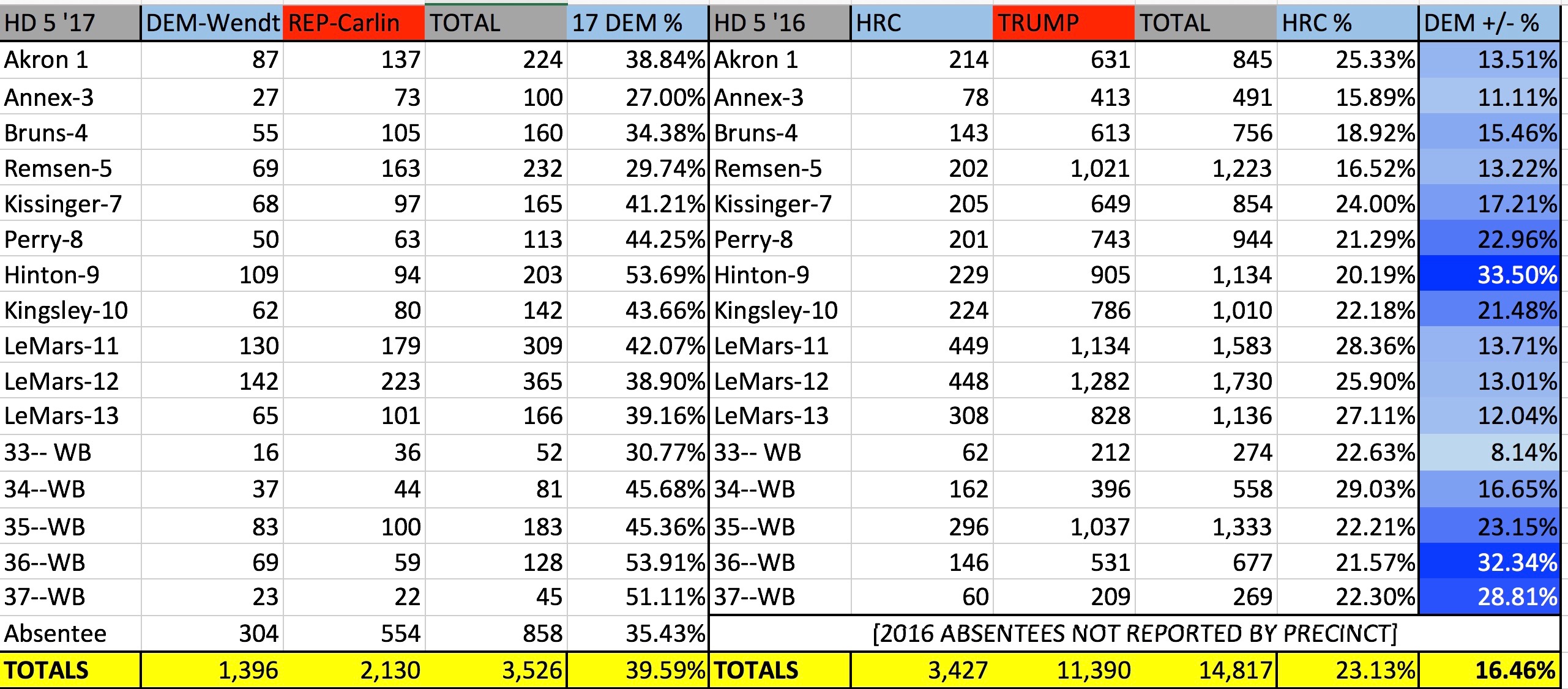Below is a table of Wendt’s and Carlin’s performance in the precincts comprising House district 6, with the 2016 statehouse results on the right. The far right column details the per-precinct change in Democratic vote share from the 2016 legislative election to Tuesday’s. Every precinct moved leftward by double digits.