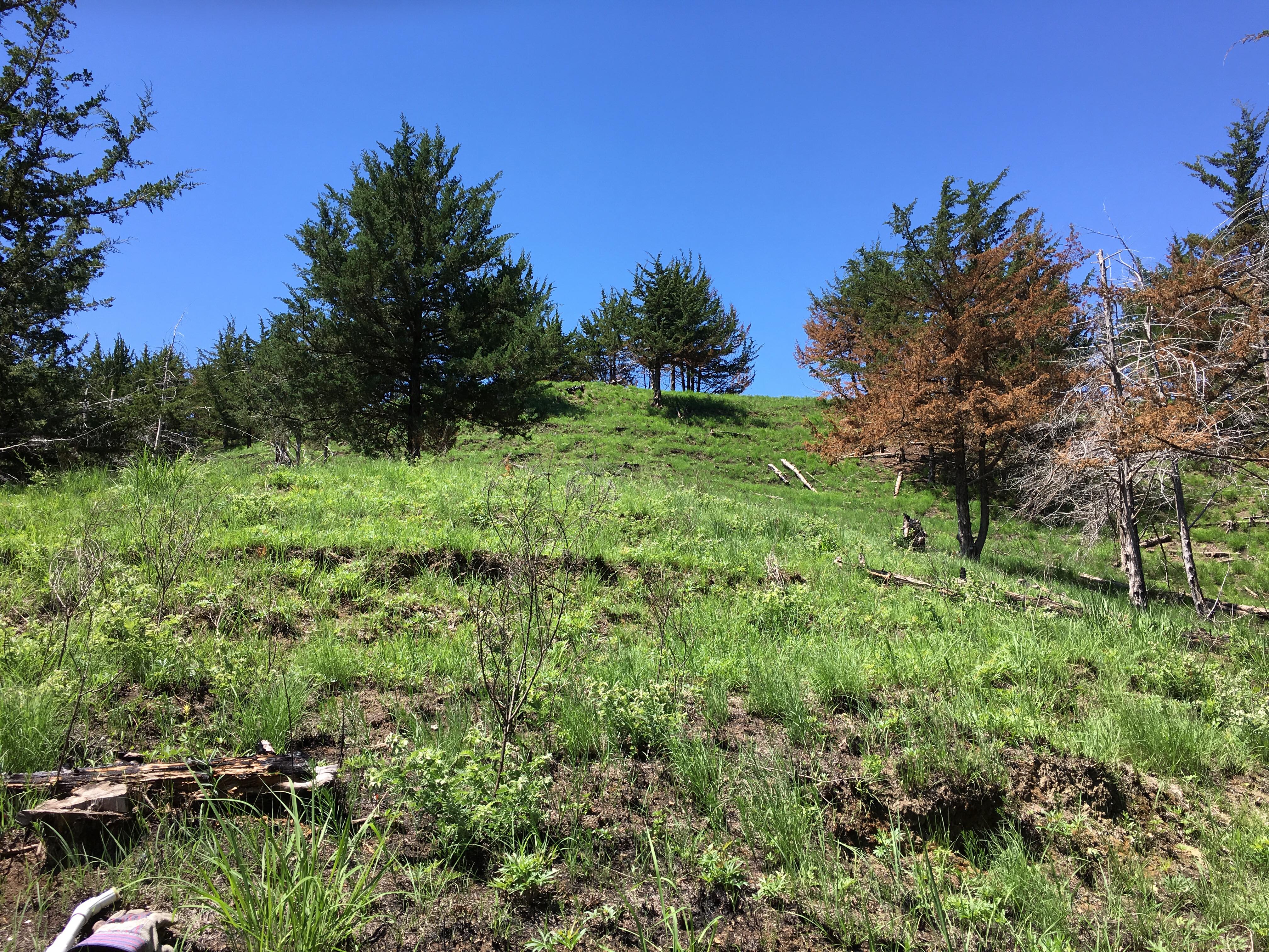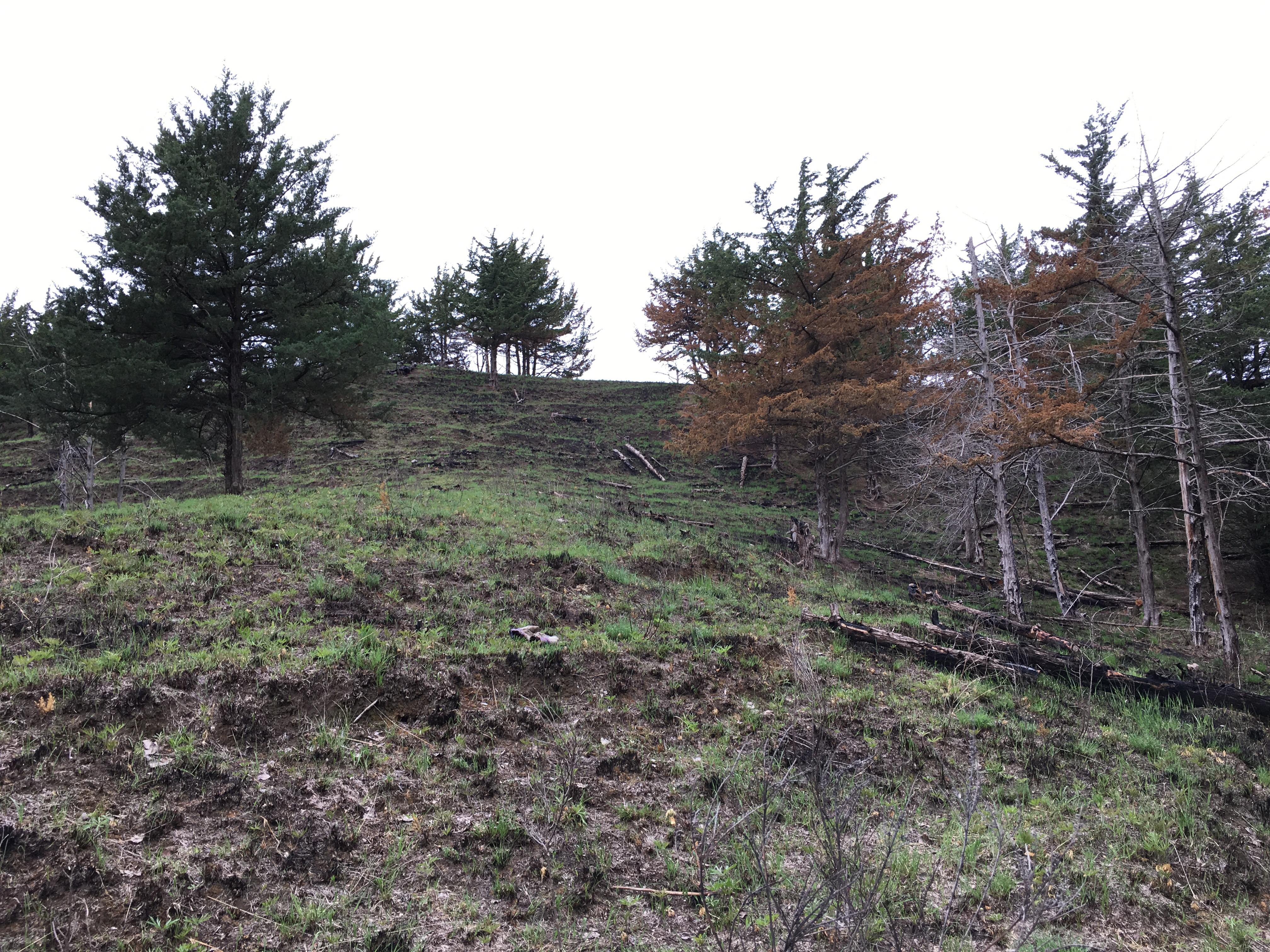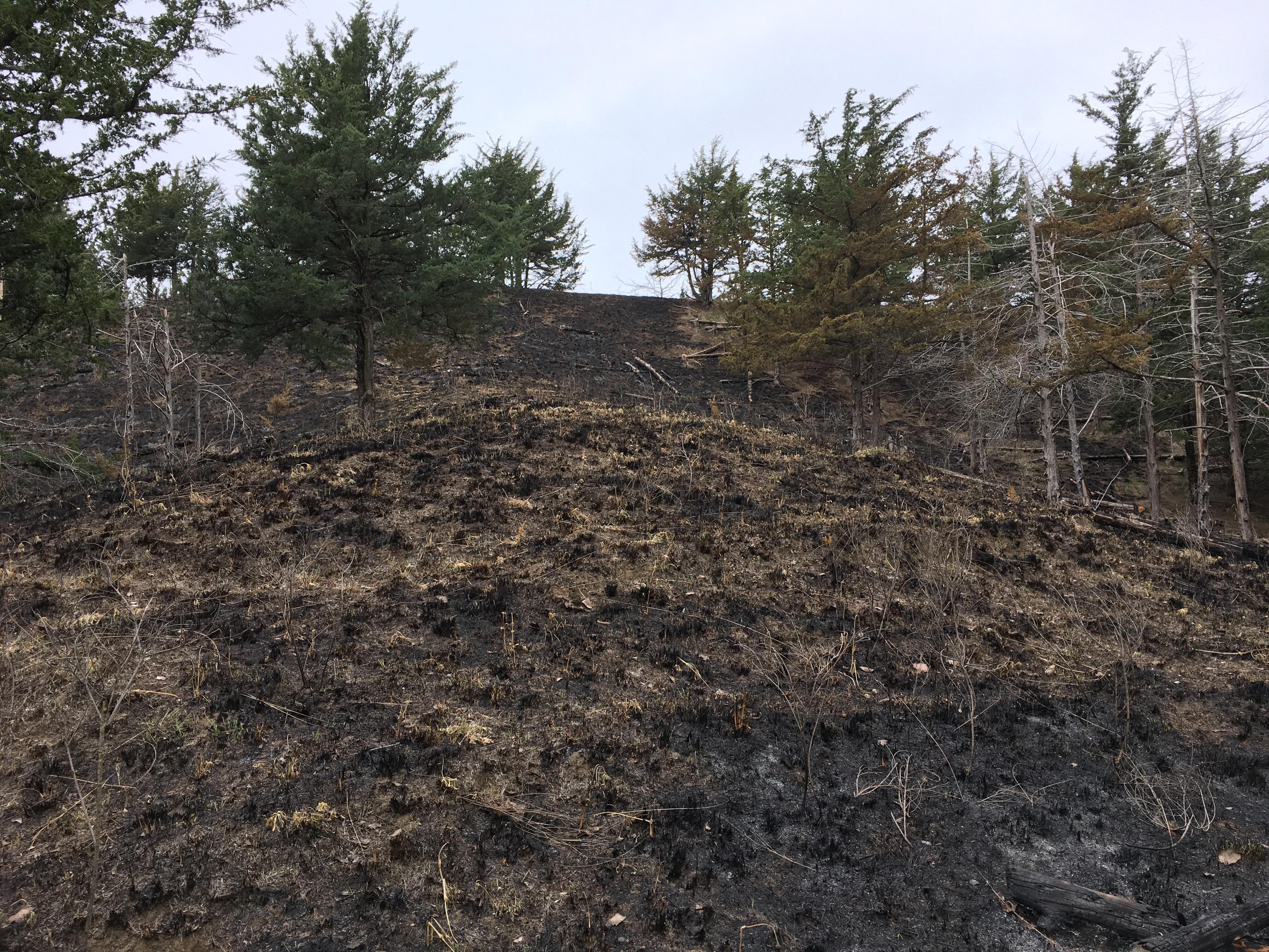 Eventually, I found myself wanting to start a project of my own. To that end, I found and purchased a cedar-infested native prairie remnant in the Loess Hills of western Iowa. I won’t detail all the events leading up to the acquisition of the property, or discuss its features or the restoration work that I’ve done there over the last 10 years, as these are well-described in my book. What I will include here is a new series of time-lapse photographs after a prescribed burn in May 2018 looking up a hillside I cleared of cedars. These pictures help illustrate both the progress of the restoration, and the response of the prairie ecosystem to fire through one growing season.