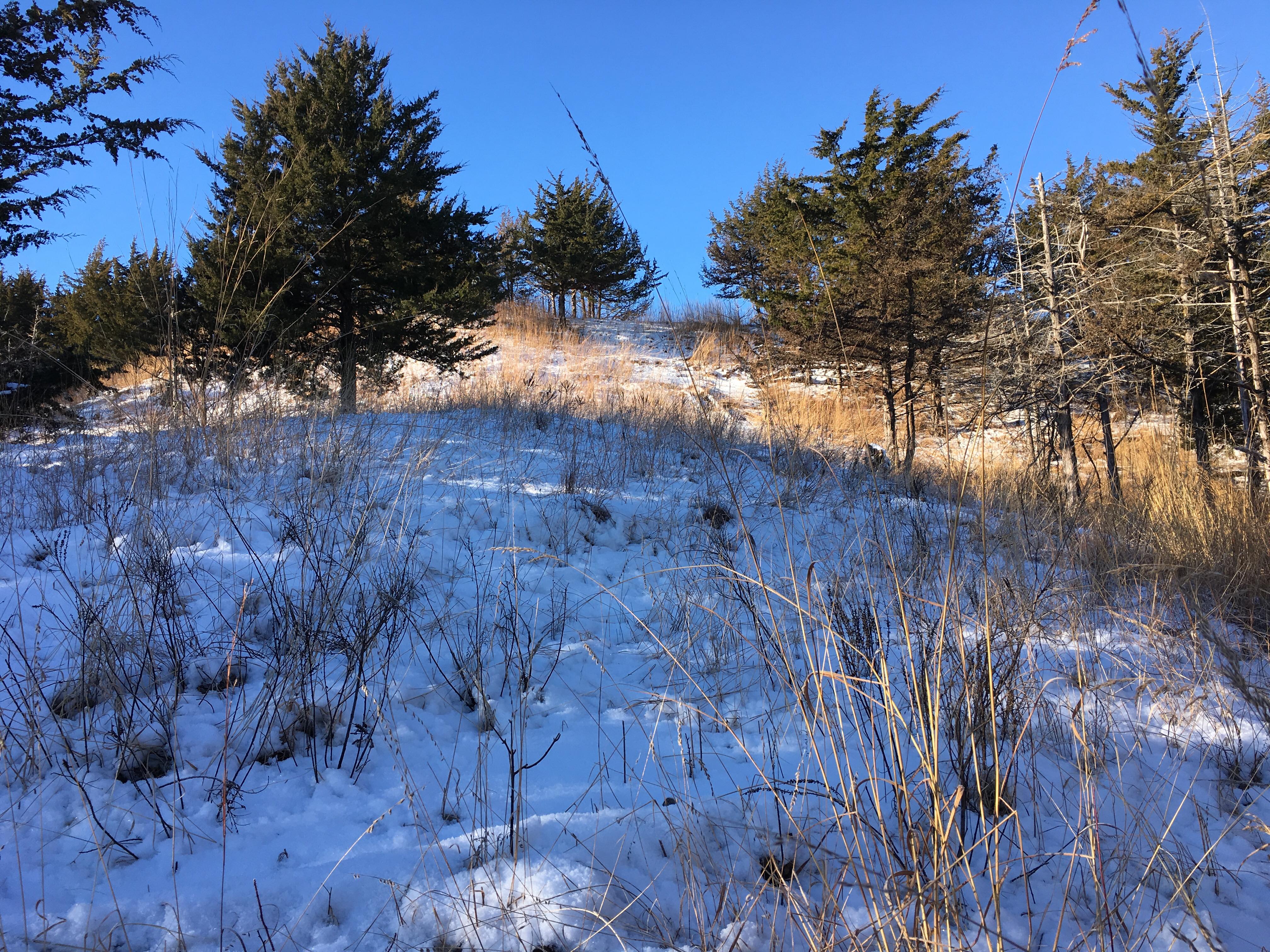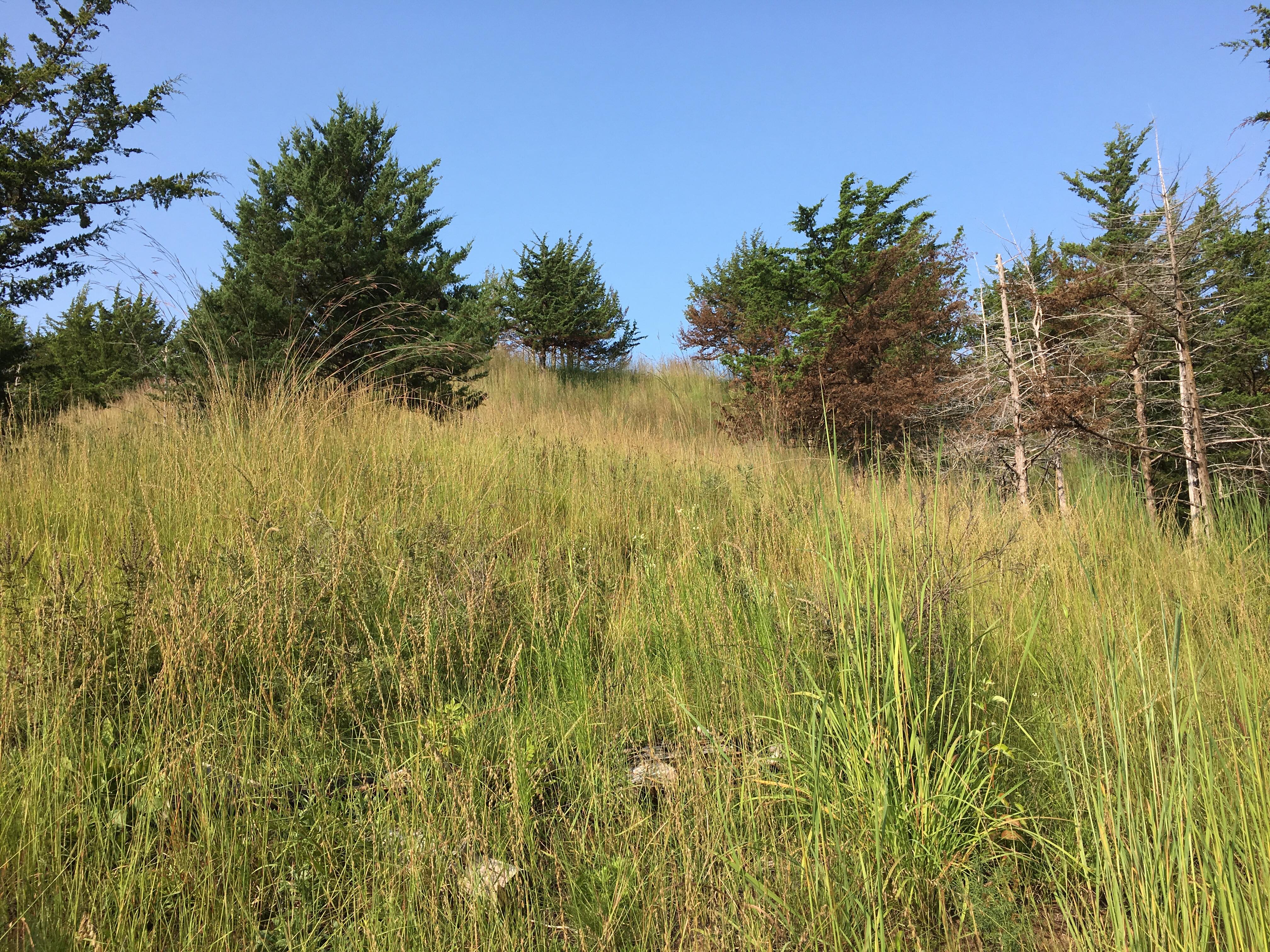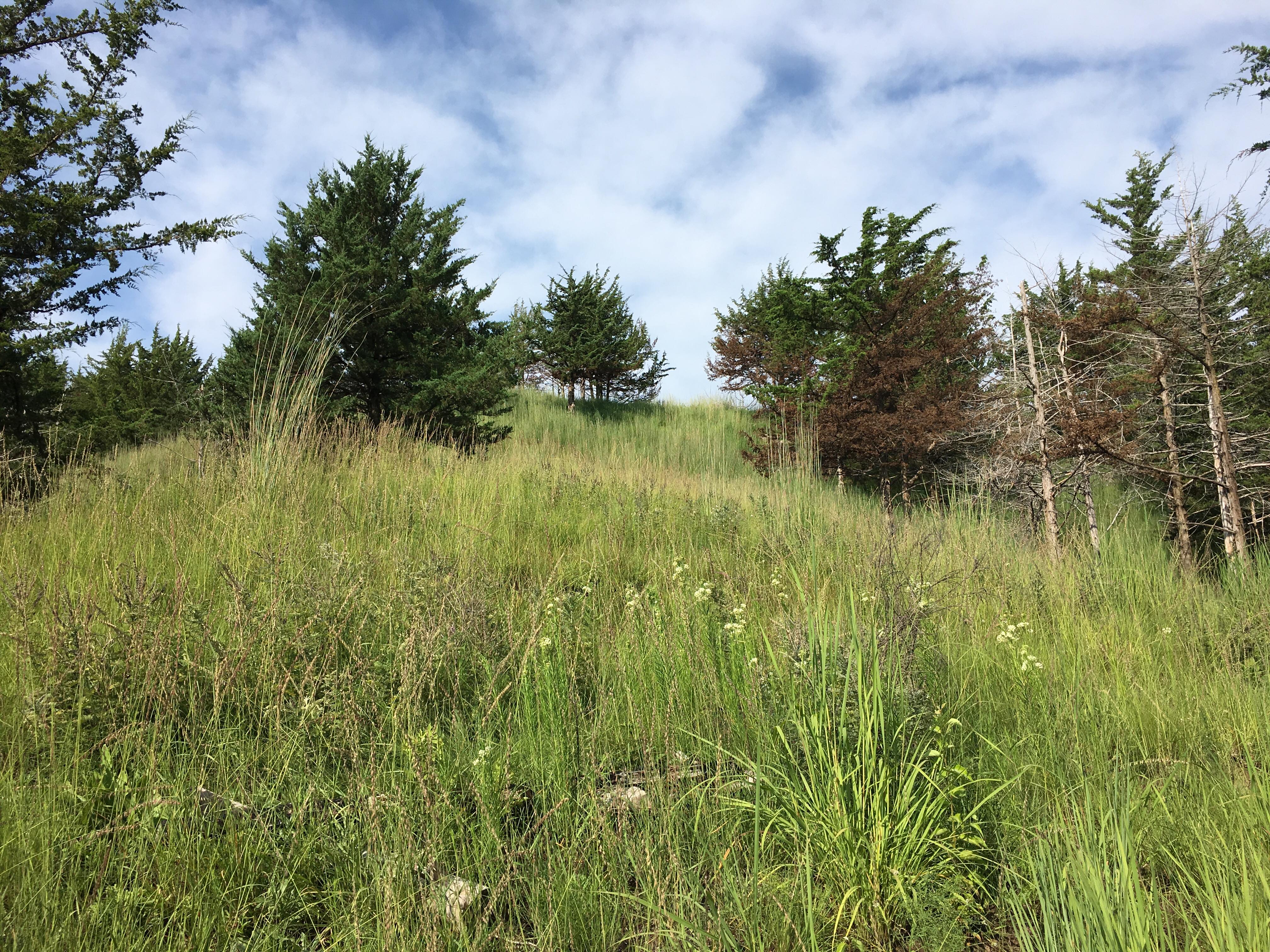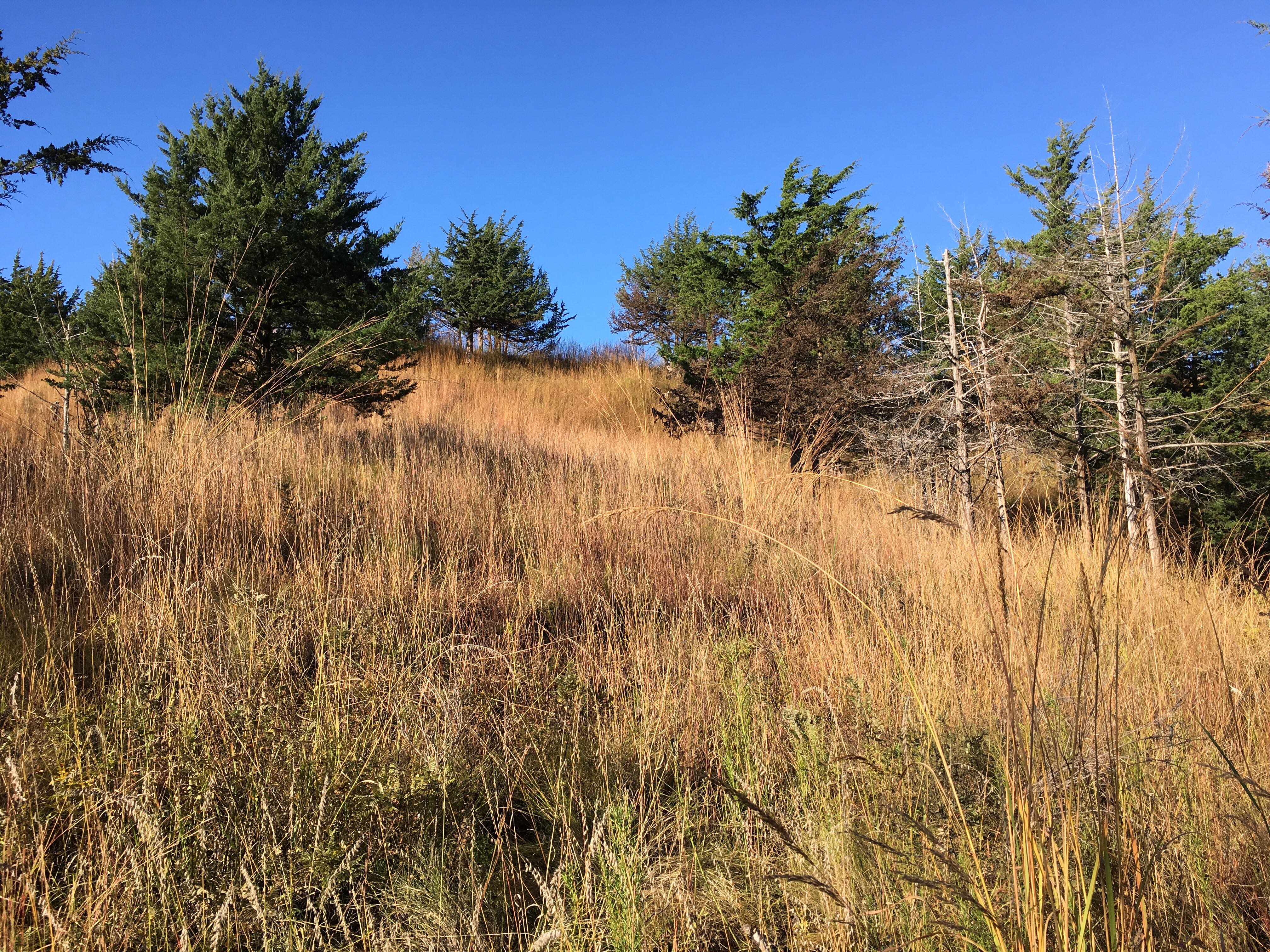 Eventually, I found myself wanting to start a project of my own. To that end, I found and purchased a cedar-infested native prairie remnant in the Loess Hills of western Iowa. I won’t detail all the events leading up to the acquisition of the property, or discuss its features or the restoration work that I’ve done there over the last 10 years, as these are well-described in my book. What I will include here is a new series of time-lapse photographs after a prescribed burn in May 2018 looking up a hillside I cleared of cedars. These pictures help illustrate both the progress of the restoration, and the response of the prairie ecosystem to fire through one growing season.