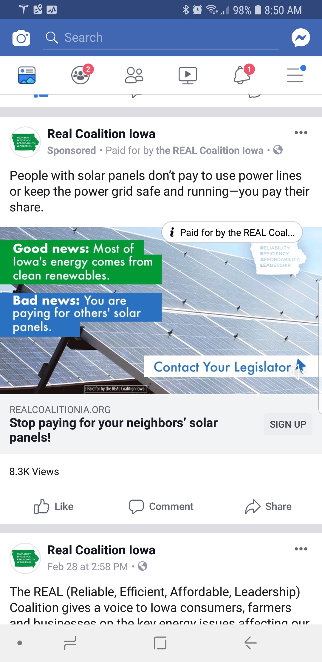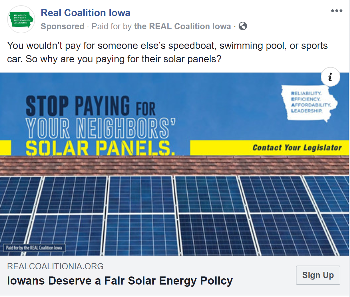 Now it seems that utilities and other parties in Iowa have created a dark money group called the REAL Coalition that is advocating for “tariffs” (also known as MORE TAXES) on those who produce their own clean energy. On their website and in social media advertising, they posture as a group promoting wind and solar power. You can find some of the confusing Facebook ads below.