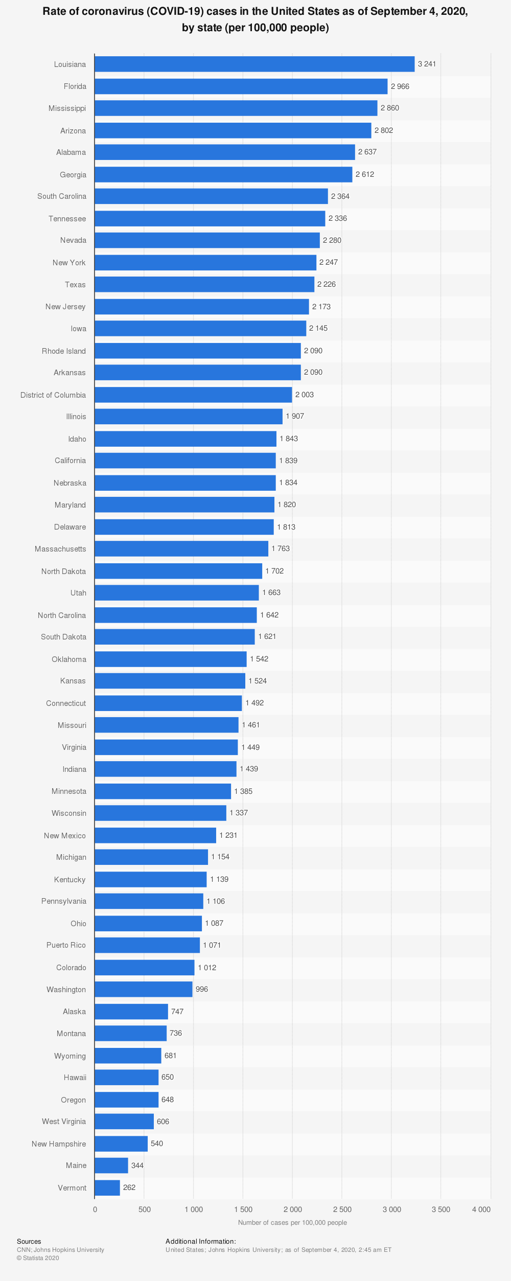 The explosion in Iowa’s case counts, death numbers, and positivity rates have belied Reynolds’ assertion on May 5 that “it’s only going to get better” as Iowa tests more people for COVID-19. Our state’s transmission rate has been above the level indicating uncontrolled spread all summer. Data compiled by Johns Hopkins University and CNN show that as of September 4, Iowa’s per capita rate of coronavirus cases was nearly as high as that of New Jersey and New York. Statista prepared this graphic: