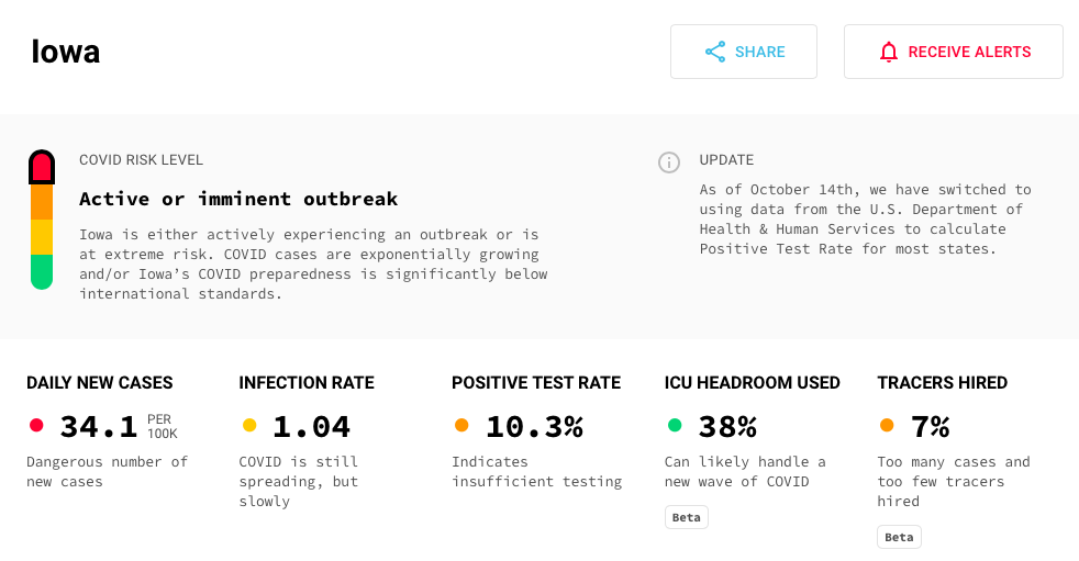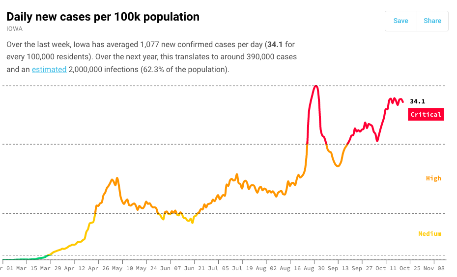 The latest White House report, dated October 18, noted the increase in cases and test positivity: “Iowa had 238 new cases per 100,000 population in the last week, compared to a national average of 117 per 100,000.” It repeated the advice about “comprehensive mitigation efforts” to avoid “prolonged community spread and increased fatalities.” A new addition to the recommendations: “In red and orange counties, both public and private gatherings should be as small as possible and optimally, not extend beyond immediate family.”