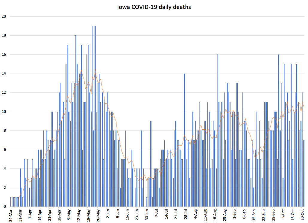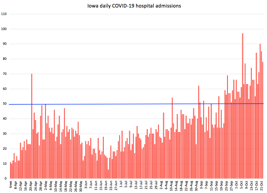 The daily hospital admission numbers are on a steep upward curve as well. The blue horizontal line represents 50 new admissions for COVID-19. Before September 22, Iowa reached that level only seven times. Since September 22, new hospital admissions have exceeded 50 every single day. UPDATE: The state reported 101 hospital admissions on October 23 (a new record) and 85 admissions the following day.