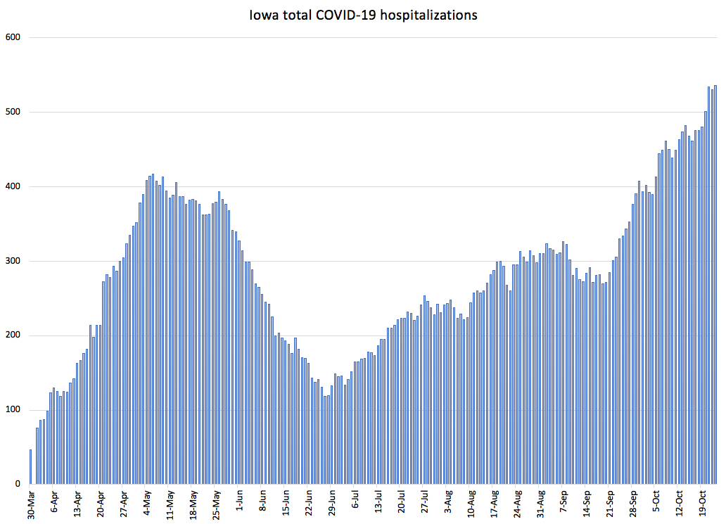 Note the trend. Hospitalizations reached a low point in late June, then rose slowly for the rest of the summer, dipped a bit after Labor Day, and have taken off during the past month. UPDATE: Iowa reached a new high of 545 COVID-19 hospitalizations on October 23, and the number rose to 561 on October 25. LATER UPDATE: Hospitalizations reached 596 by the evening of October 27.