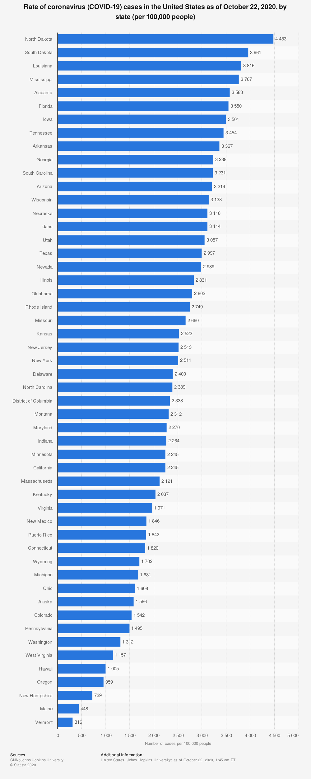 Also during the last four weeks, Iowa has moved up from ninth place to seventh on the list of most COVID-19 cases per capita. We would rank even higher, but North Dakota and South Dakota leapfrogged us and now have the worst outbreaks in the country. This graphic comes from Statista.
